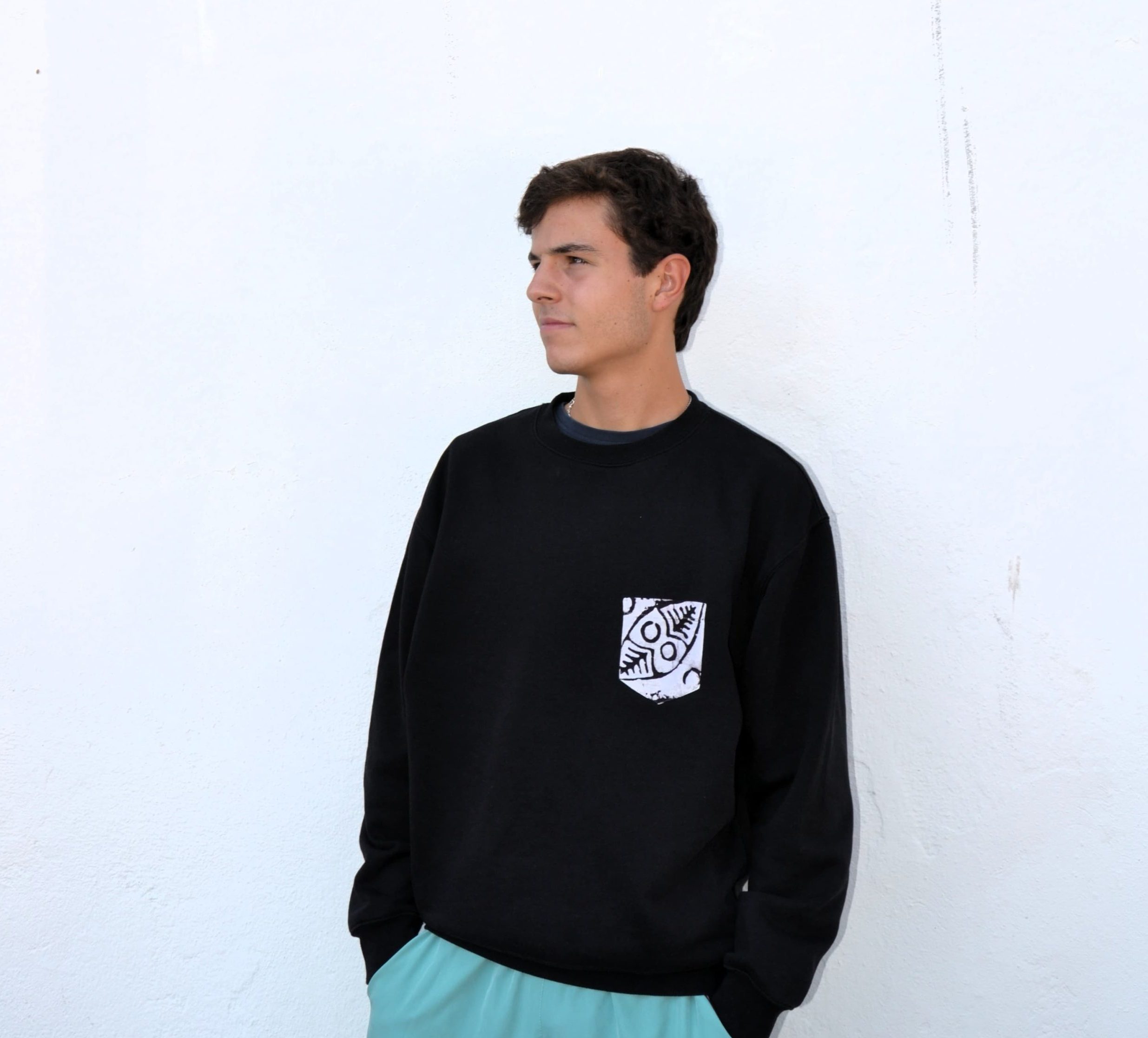 Modelo veste Pocket sweatshirt no tamanho L, mede 1,82cm de altura.