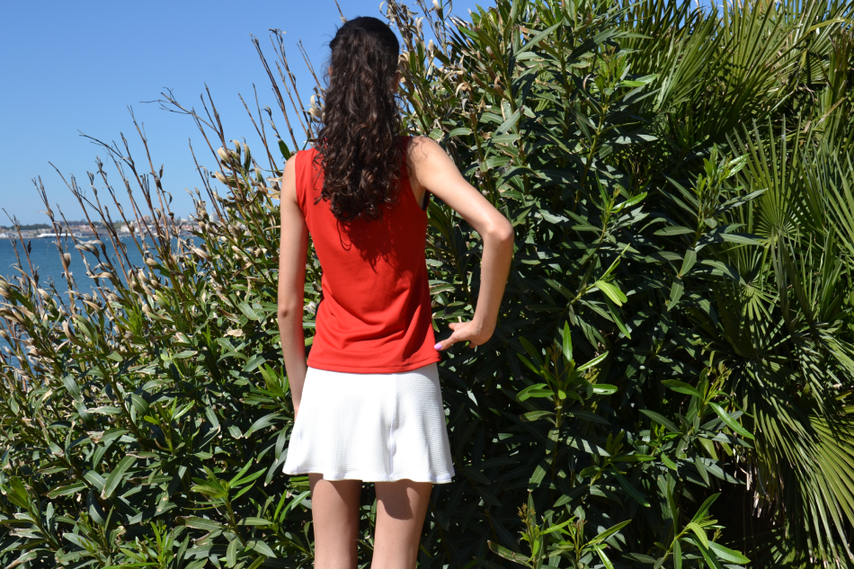 Modelo mede 1,71cm e veste Saia Eclipse branca e top vintage encarnado no tamanho S.