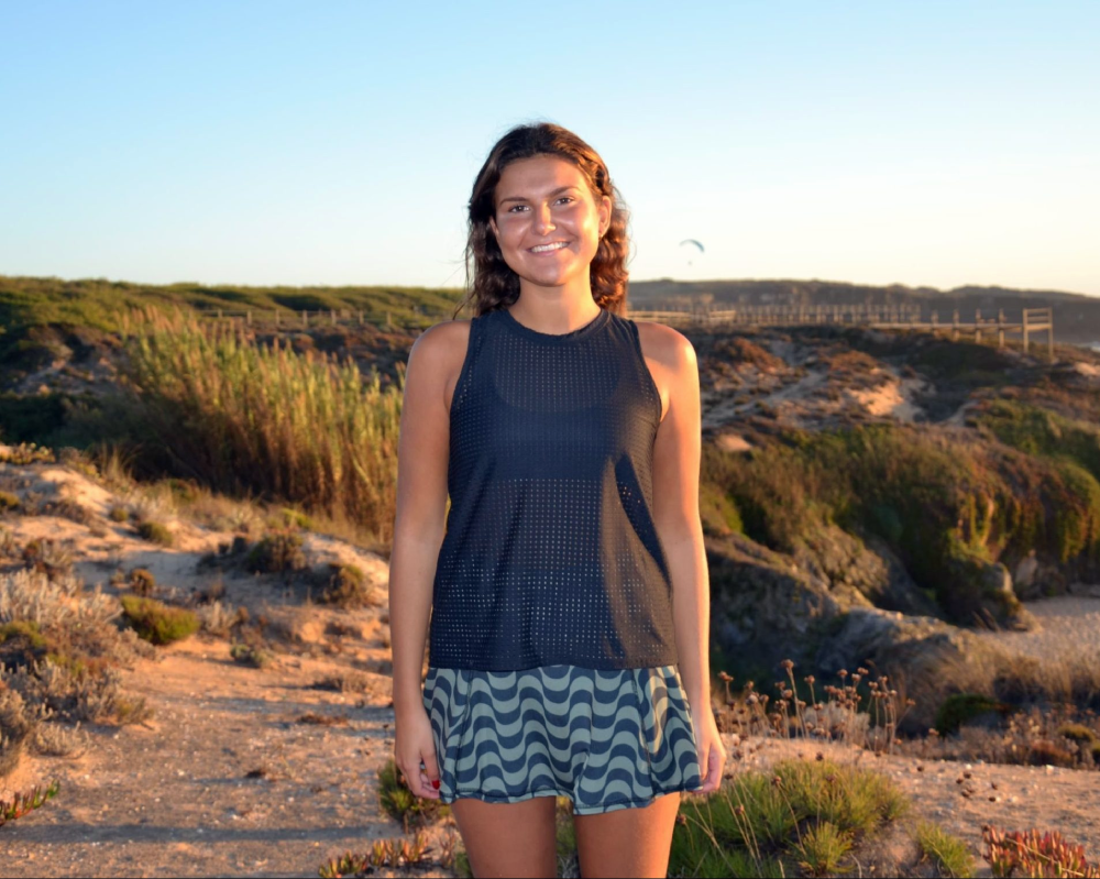 Modelo veste Saia Green Waves no tamanho M e Top Net pretono tamanho S/M, tem de altura 1,70cm.