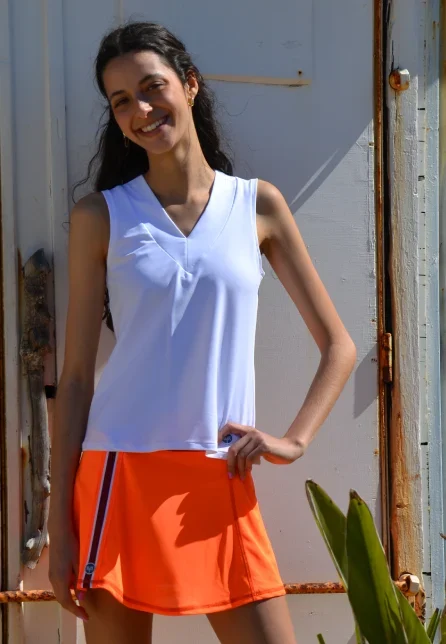 Modelo mede 1,71cm e veste saia Orange e top V branco no tamanho S.