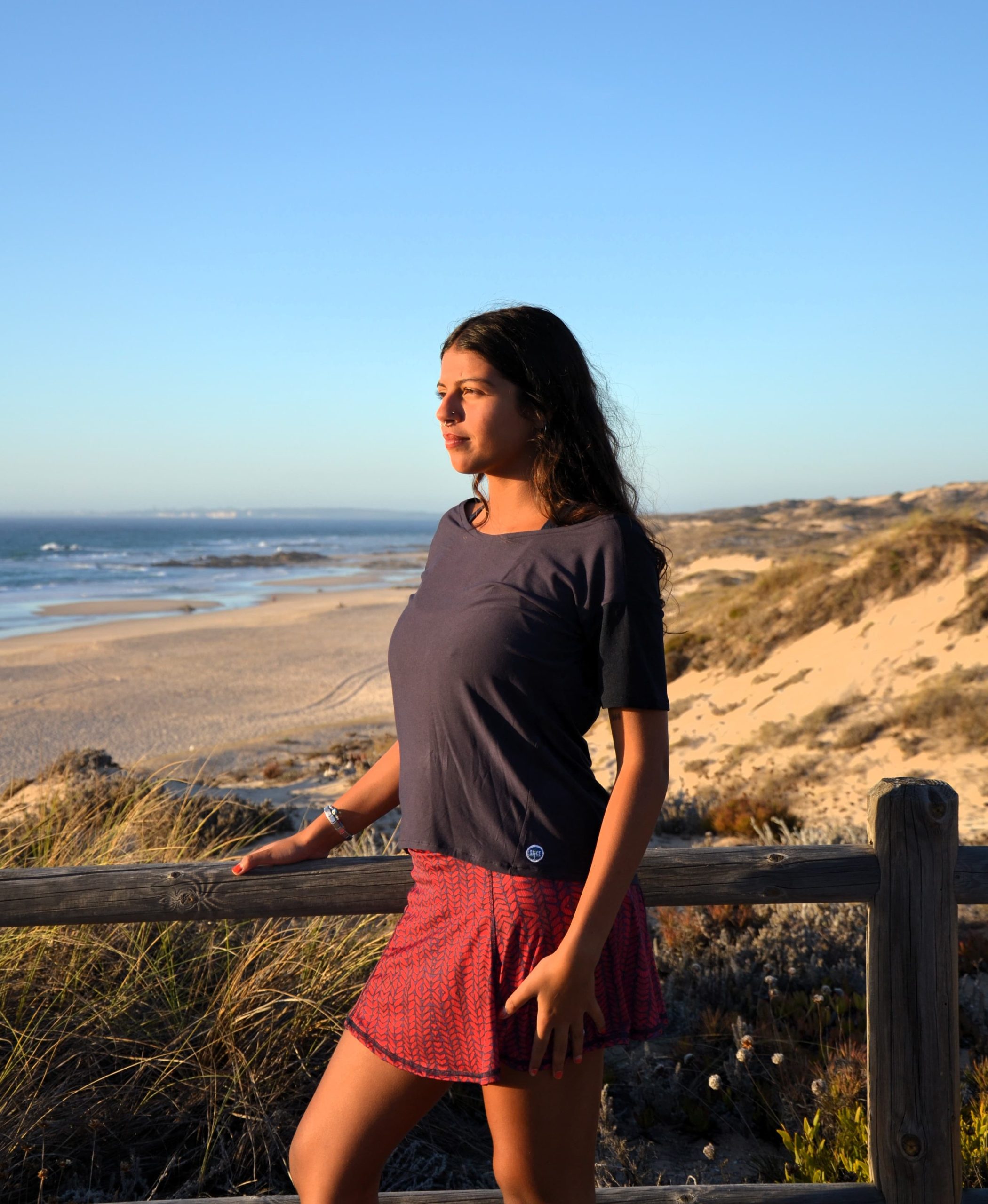 Modelo veste Top Fox Azul Marinho e Saia Red Leaves no tamanho M, mede 1,65cm de altura.